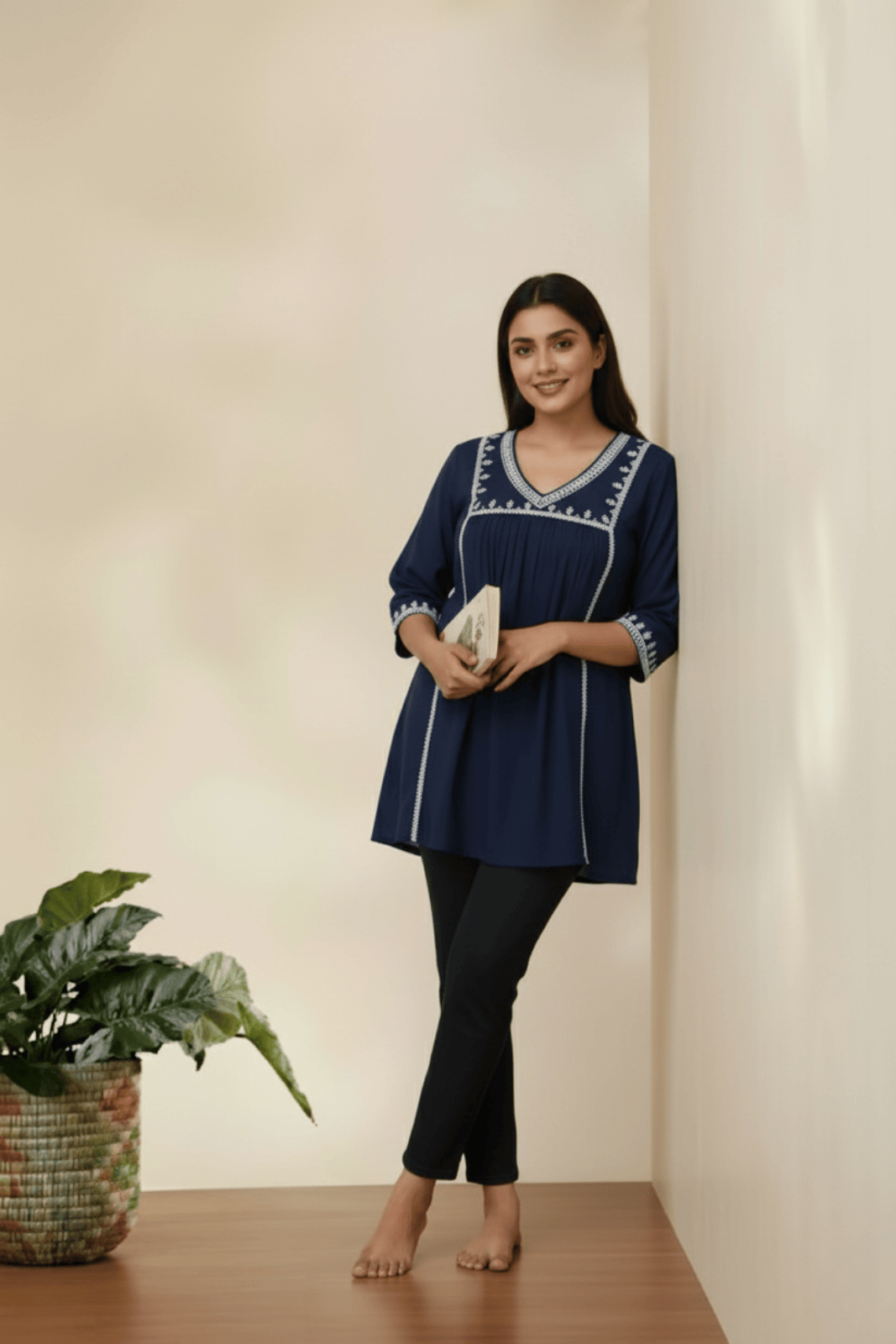 Bring elegance and comfort together with this navy blue embroidered tunic top 💙✨